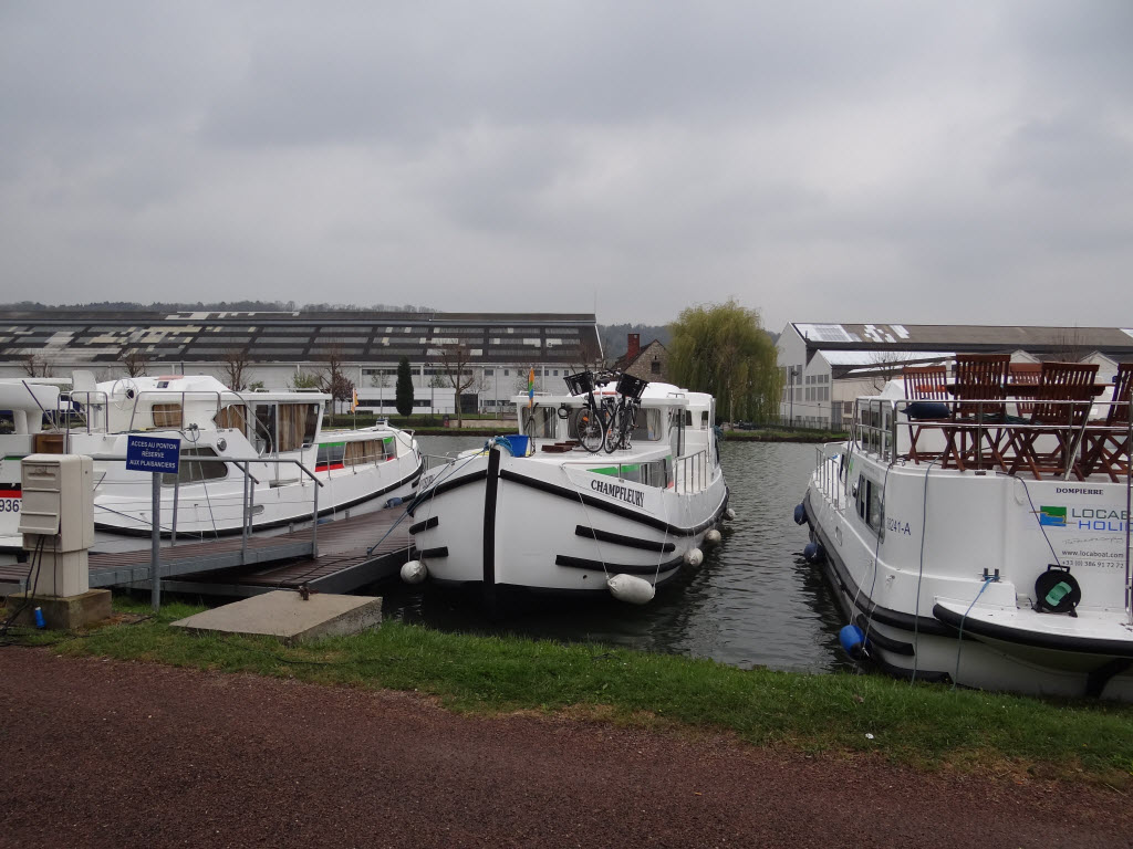 Bei trockenem, aber bedecktem Himmel fuhren wir auf der Péage, welche das Geld wie immer wert war, in Richtung Montbard. Auf der Raststätte Lochères wollten wir zu Mittag essen, aber leider war kein einziger Parkplatz frei. So fanden wir uns unversehens wieder auf der Autobahn und kamen um 14 Uhr in Montbard an. Unser Boot, die "Champfleury", war schon bereit. Wir luden also schnell das Gepäck ein und fuhren auf den Casino-Parkplatz. Leider war es schon zu spät um in den Restaurants noch etwas zu essen, aber in einer Boulangerie bekamen wir warme Tarte à oignons und eine Art Riesen-Profiterole mit Käse.