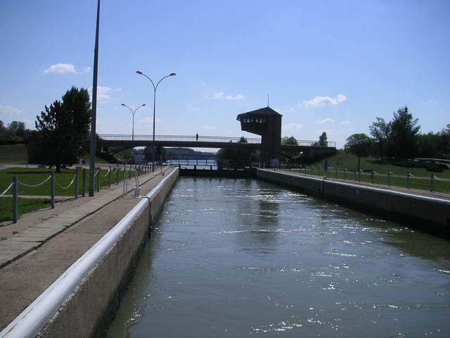 Blick zum Schleusenturm und wie man sieht sind wir die einzigen in der 185m langen Schleuse.