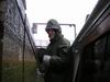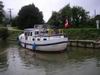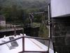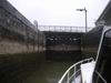 Irgendwie hängen wir zwischen zwei solchen Holzpfählen. Die Schleuse ist gestoppt, so kommt wenigstens nicht noch ein Schiff herauf. Es käme nicht an uns vorbei. Die guten Geister auf der Vom Regen in die Traufe... Endlich, wir sind wieder flott.