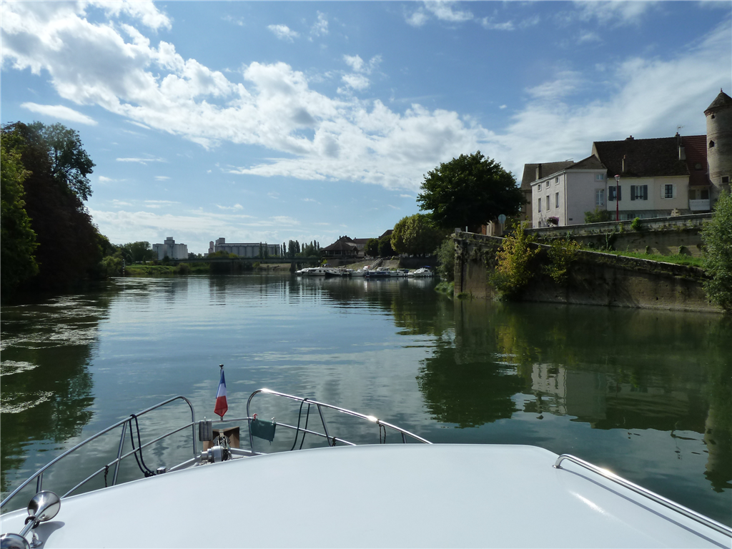Für heute war Streik angekündigt, also planten wir eine Etappe ohne Schleusen. Wir fuhren nur drei Stunden und wollten Verdun sur le Doubs besuchen. Das Rückwärts-Anlegen war dort normalerweise kein Problem. Diesmal führte der Doubs vom Regen aber mehr Wasser. Sobald das Boot querstand, wurde es von der Strömung seitlich abgetrieben. Die Capiteuse kannte das und fuhr nochmal eine Schleife, um rückwärts gegen die Strömung zu drehen. Allerdings war die Schleife zu eng, so klappte es wieder nicht.