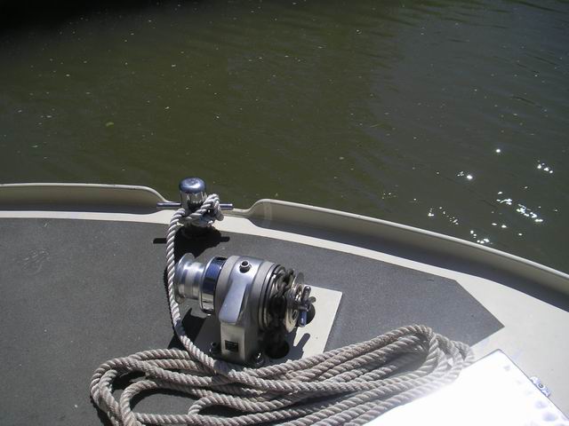 Die nie gebrauchte Ankerwinsch und eine seltsam befestigte Leine. Aber nur so fliegt das Auge nicht von der Klampe.