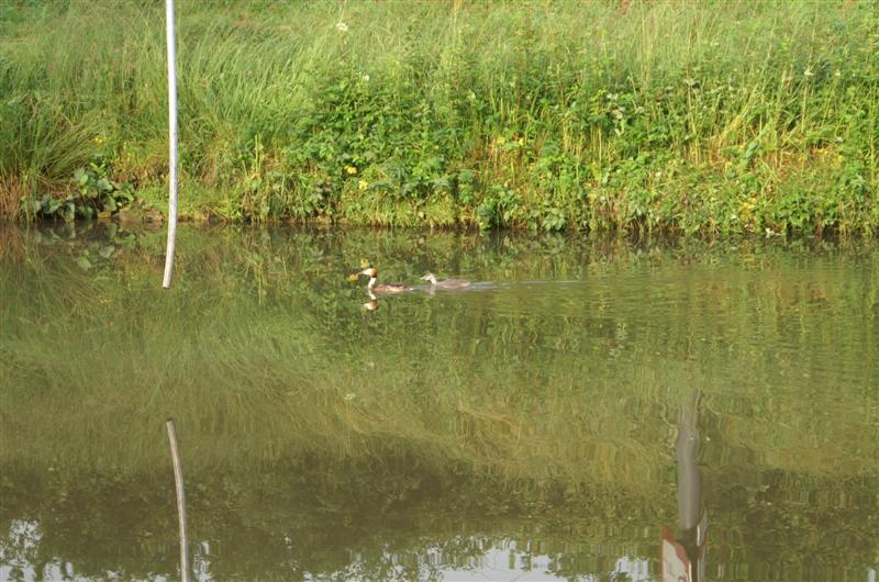 Mutter und Kind Haubentaucher am Morgen auf Futtersuche