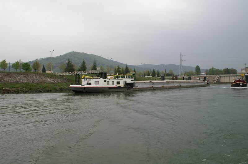 Seit Valence hats mehr Verkehr auf der Rhône; hier wartet schon einer, als wir aus der Schleuse fahren.