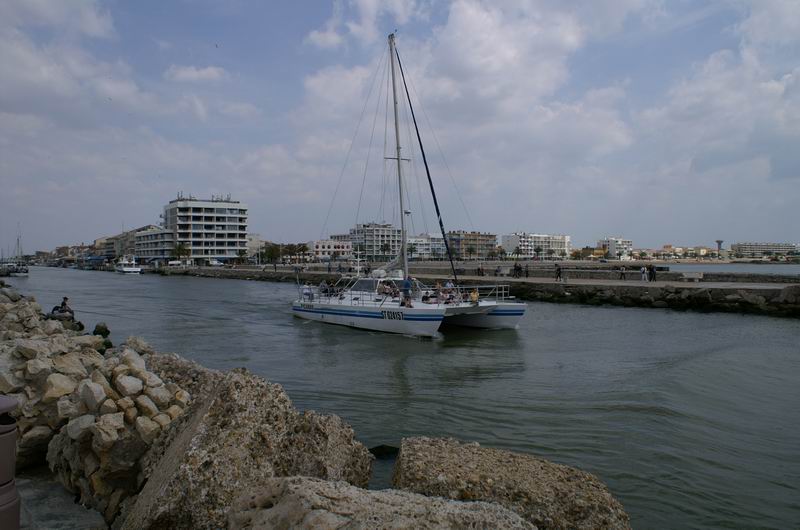 Bei schönem Wetter machen wir eine Ausfahrt auf dem Katamaran "Picardie". Die Route führt zuerst nach Grande Motte, dann quer über die Bucht nach Port Camargue und wieder zurück nach Grau du Roi. Wir fahren auch in die Häfen von Grande Motte und Port Camargue ein. Vor allem Port Camargue ist sehr beeindruckend, eine riesige Anlage mit Wasserwegen und Häusern mit Bootssteg anstelle eines Parkplatzes.
