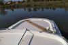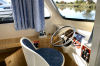 Der Salon mit Steuerstand. Die Polster sind bequem, aber der Tisch hat sehr unpraktische Beine. Blick nach hinten: links die Küche, rechts der Aufgang zum Oberdeck. Viel Stauraum im Salon.
