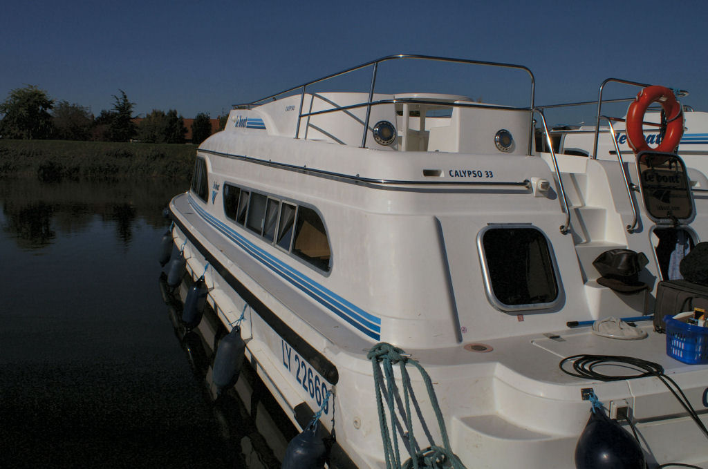 Unsere Calypso hat, wie bei Le Boat üblich, keinen Namen, aber die Nummer 33. Der erste Eindruck ist gut, mit 13.25 m Länge bietet die Calypso nun wirklich viel Platz für zwei Personen, wir haben drei Kabinen mit sechs Betten zur Auswahl. Allerdings ist der Stauraum in den Kabinen etwas beschränkt; wenn da wirklich sechs Leute an Bord sind, wo bringen die alle ihre Kleider unter? Die beiden Badezimmer sind ebenfalls eng ausgelegt, die WCs eingezwängt zwischen Wand und Lavabo, kein Platz für ein Necessaire und nur grad ein Aufhänger für ein Handtuch. Wir sind wieder froh, dass wir unsere unverzichtbaren spurlos-ablösbaren Tesa-Haken dabei haben.