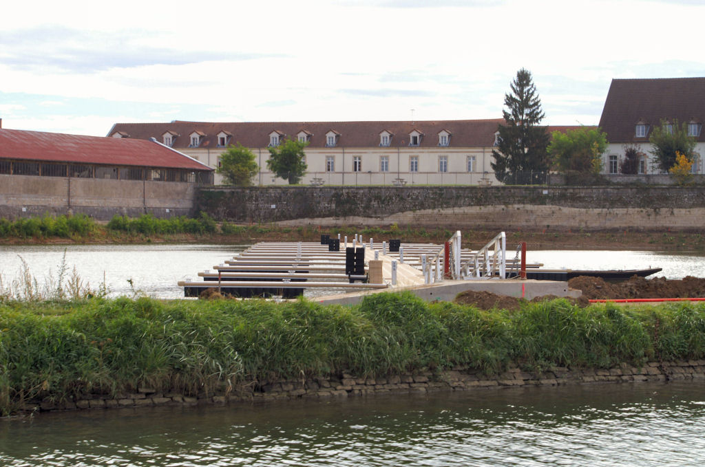 Einen Pluspunkt hat die Calypso: sie bleibt gern ruhig am Ufer liegen. So kann der Käptn die Planke, Heringe und Leinen an Bord werfen und danach noch seelenruhig aufs Boot klettern. Wir fahren weiter Saône-aufwärts, und nun kommt sogar die Sonne hervor, die sich in den letzten Tagen rar gemacht hat. Oberhalb vom voll belegten Steg sehen wir dann den neuen Hafen von H2O, welcher auch schon in einem Bereich, zwar noch ohne Wasser und Strom, aber dennoch benutzbar gewesen wäre, tja, zu spät. Kurz nach Mittag treffen wir bei strahlendem Sonnenschein in Pontailler sur Saône ein. Noch hat es viel Platz an den Schwimmstegen im Hafenbecken, und der Käptn legt perfekt rückwärts an. Beim Hafenmeister zahlen wir neun Euro inklusive Strom. Eine aktuelle Karte des Canal de Bourgogne hat er aber leider nicht.