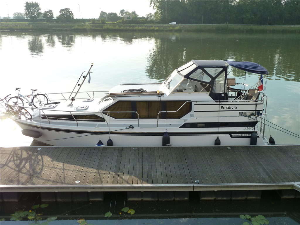Als wir den Herrn gefunden hatten, gingen die Formalitäten schnell, das Boot "Emalivia" war schon bereit und die Einweisung in Ordnung. Das Boot war eine holländische Stahlyacht, Baujahr 2008, mit Marine-WC, aber nicht den bekannten Jabsco. Die Küche war klein, und es gab keinen Backofen, sondern nur eine Mikrowelle. Dafür hatte es einen Wechselrichter: 220V in Salon, Küche und allen Kabinen, sogar in den Badezimmern. Wir konnten also auch ohne Landstrom und während der Fahrt alle Geräte benutzen (und laden). Einen Bugstrahler hatte die Emalivia auch, das konnte in engen Häfen hilfreich sein bei über 12 m Länge. Den Stauraum empfanden wir als weniger als auf den üblichen GFK-Mietbooten.