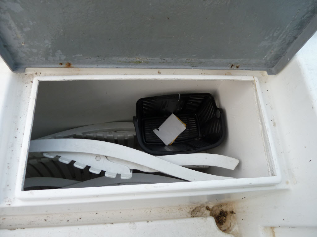 Stauplatz in der Terrasse: Backbord-Backskiste mit Stühlen und Velokorb