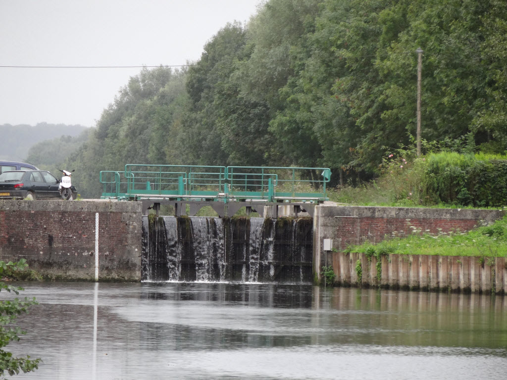 Nach den üblichen Gipfeli und der Zeitung legen wir ab, es regnet zwischendurch wieder. Heute ist Sonntag, deshalb werden wir von Studenten geschleust. Es regnet immer mehr und hört nicht mehr auf. Die letzte Schleuse in Picquigny ist eine doppelte, das untere Becken mit Schrägwänden. Auf der Hinfahrt wurde nur das obere Becken benutzt, wie bei allen solchen Schleusen hier. Aber diesmal wollte die seltsame Schleusenwärterin (definitiv keine Studentin) es kompliziert.