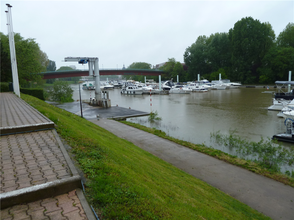 Heute war Sonntag, der schöne Carrefour und alles was sonst noch in der Nähe des Hafens lag, waren geschlossen. Wir konsultierten die Avis von VNF und die Vigicrues-Seite und stellten fest, die Saône würde noch länger steigen, die Strömung nahm zu. Wir beschlossen Retraite in den Kanal. Nach einem lustigen Ablegemanöver durch "rückwärts treiben lassen am langen Steg" - der zum Glück komplett frei war - tankten wir doch noch Diesel auf. Der Pegel war mittlerweile zu hoch, um den vorgeschriebenen Weg unter der Steinbrücke durch aus dem Hafen zu fahren. Wir liessen uns rückwärts treiben und drehten dann Richtung Süden und Saône.