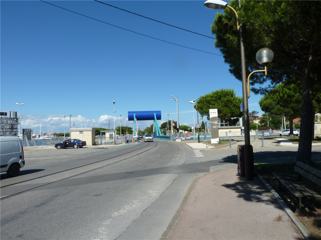 Von weitem sichtbar: die Hebebrücke der Schleuse zum Hafen