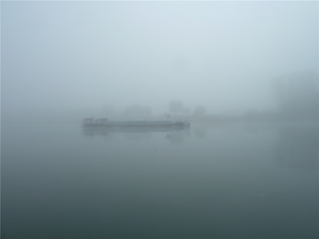 Ein Schiff taucht schemenhaft im Nebel auf...