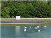 Nette Schilder stehen da am Ufer