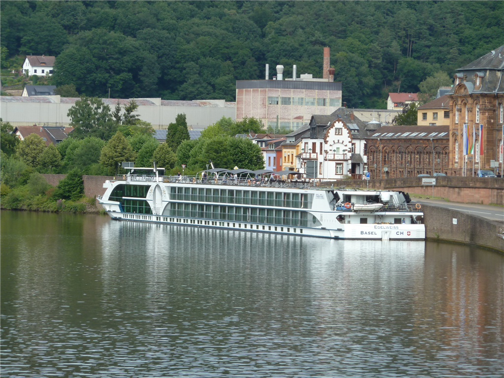 Am Dienstag endlich legte die Edelweiss zum ersten Mal ab. Weil die Saar zu eng war, konnte sie nicht wenden und fuhr die ersten paar Kilometer rückwärts. In einem Frachthafen gab es dann das Wendemanöver, und danach fuhren wir richtig herum bis Mettlach. Dort legten wir am Nachmittag an. Wir spazierten "individuell" ins Städtchen, also nicht auf einem geführten Rundgang.