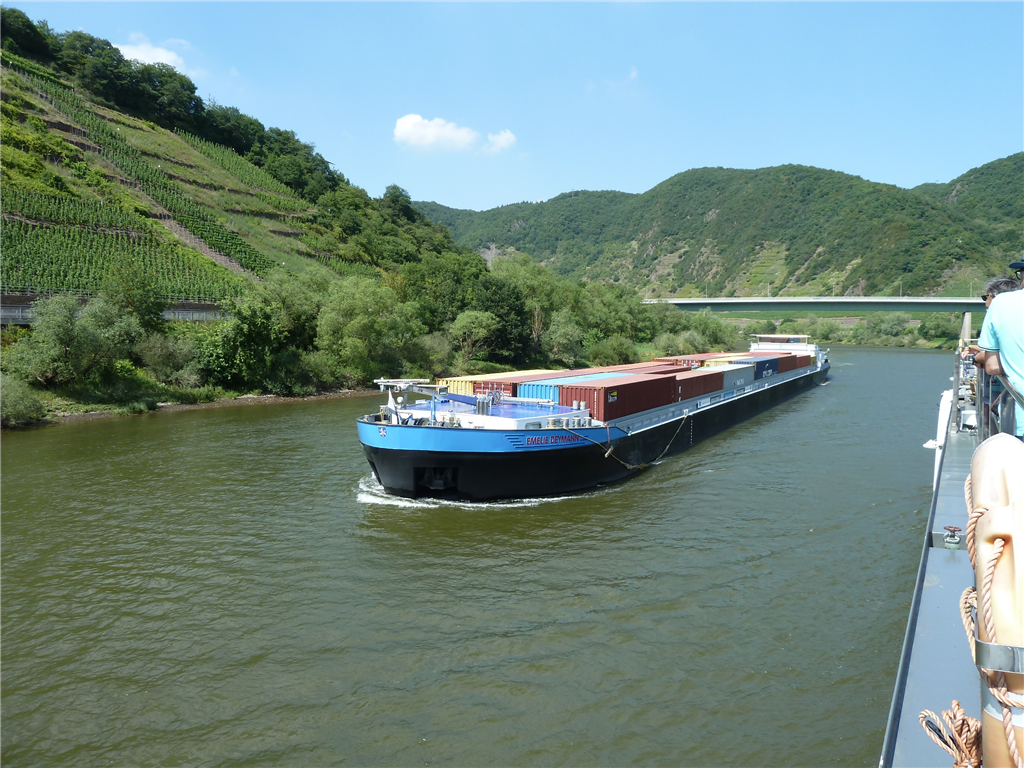 Wir nutzten den Vormittag, um Zell auf eigene Faust zu erkunden. Es war ein Weinort, überall Weinhandlungen, Stuben und Degustationen, und direkt hinter den ersten Häusern schien der Berg steil hinaufzuragen. Die schwarze Katze war nicht nur als Statue am Anleger präsent, sie erschien überall an Schaufenstern, Fassaden und in Namensschildern. Vor dem Mittagessen legten wir ab und genossen die Sicht auf die Weinhänge der Mosellagen. Um vier trafen wir in Cochem ein, wo das Anlegen und Festmachen eine spannende Geschichte war. Dies war erst die zweite Fahrt der Edelweiss hier, so mussten die Ringe zum Festmachen erst gesucht werden. Es landete dann auch prompt eine Leine im Wasser, nachdem der Kapitän klar "nicht ins Wasser!" gerufen hatte...
