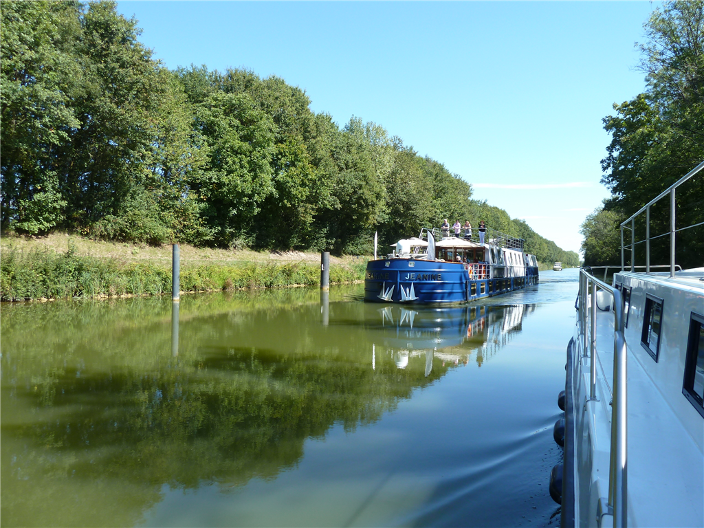 Morgens war es mit 14 Grad kühl im Schiff, wir stellten die Heizung an aber es half nichts. Die Heizung war schlichtweg ausgeschaltet. Nachdem der Käptn den Schalter gefunden hatte, heizte es ein bisschen, aber nur in den Salons. Zum Glück wurde es draussen bald warm und nachdem die meisten Mietboote weggefahren waren, legten wir auch ab. Der Käptn drehte das Boot mühelos und fuhr süferli aus dem Hafen heraus. Auf der Saône machte er dann einige Wendemanöver, suchte die "bessere" Seite und so lernten wir das Boot etwas kennen.