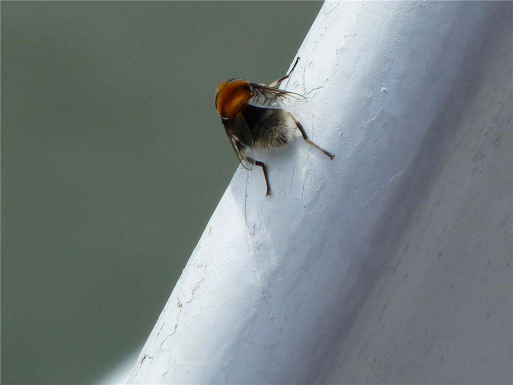 Diese Fliege, die sich als Hummel tarnt, hat sich in unseren Tisch verliebt.