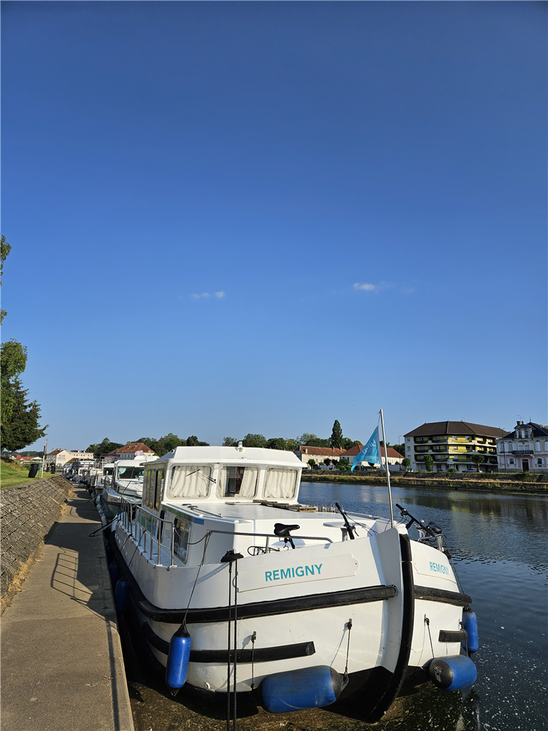 Bei immer noch schönem und heissem Wetter fuhren wir weiter bis Gray. Die Saône war schön und friedlich wie immer, aber der Wasserstand sicher 30 cm niedriger als normal. In den Kanalabschnitten wucherten die Wasserpflanzen bis an die Oberfläche. So hatten wir plötzlich zu heisses Wasser im Motor, fast 100 Grad. Wir nahmen das Gas zurück, worauf auch die Temperatur wieder runterkam. Vielleicht war der Wasseransaugstutzen verstopft durch das Grünzeug? Wir drehten einige wilde Kurven und versuchten alles abzuschütteln, und tatsächlich funktionierte das. Die Wassertemperatur ging auch bei Vollgas nicht mehr über die üblichen 80 Grad hinaus.