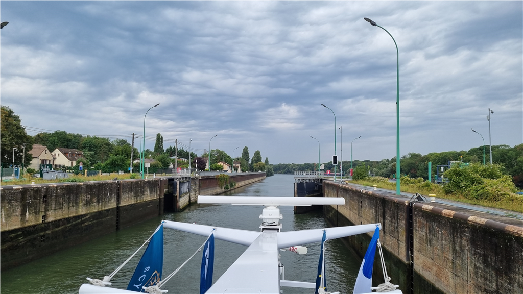 Schon in der Nacht hatten wir in Conflans angelegt. Nach dem Frühstück fuhren die Ausflügler zum Schloss Chantilly, wir spazierten individuell in Conflans herum. Am Ufer lagen viele Frachter, wir besuchten einen kleinen Markt und die Schiffskirche, und dann gab es Aperitiv in einer Brasserie am Quai. Rundum hörte man Schweizerdeutsch... Gegen Mittag gingen wir wieder an Bord, und bald legten wir ab und genossen die schöne Fahrt auf der Seine. Abends spielte jeweils die Bordmusikerin Albena im Salon, das war angenehme Unterhaltung.