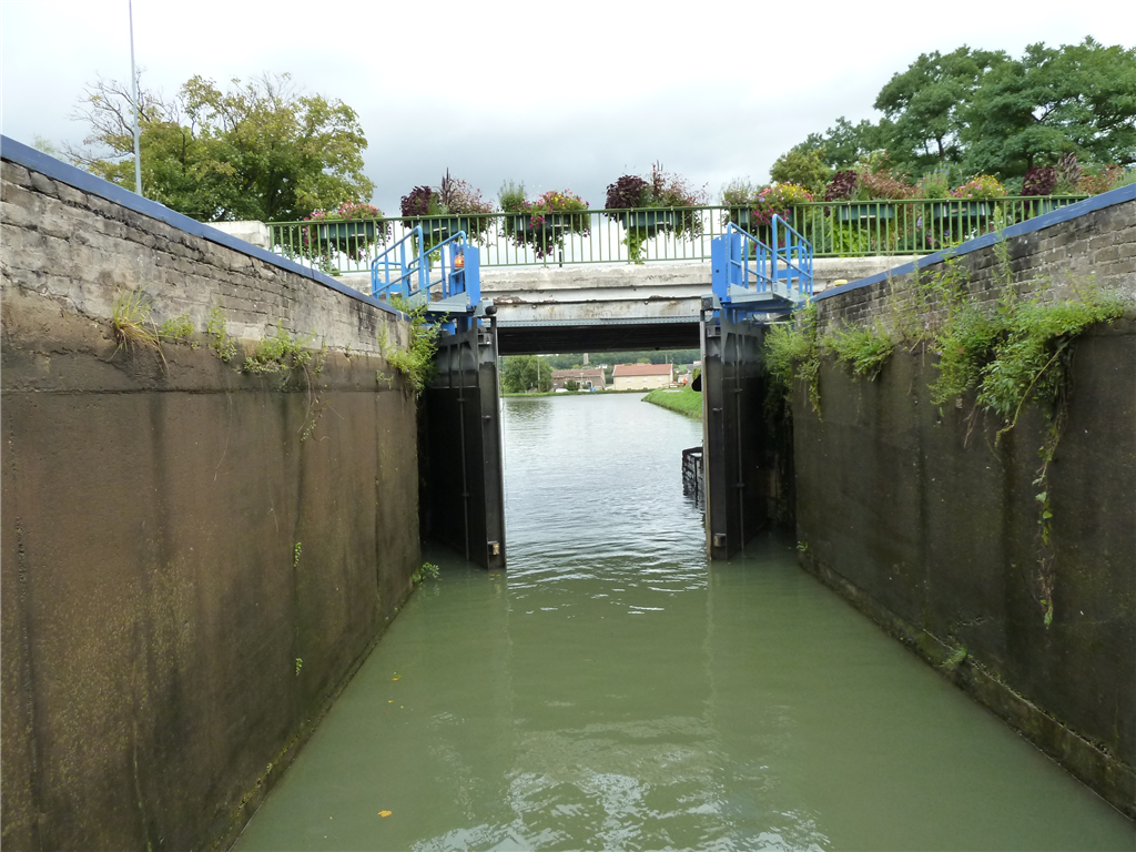 Punkt neun Uhr gingen die Schleusenampeln an, und wir legten ab. Die Einbahnstrecke war hübsch, aber die zweite Schleuse zeigte rot-rot. Ich rief den VNF an und der Monsieur kam auch bald, so konnten wir die restlichen elf Schleusen in Angriff nehmen. Die hier üblichen Dreimeterschleusen waren schon anstrengend.